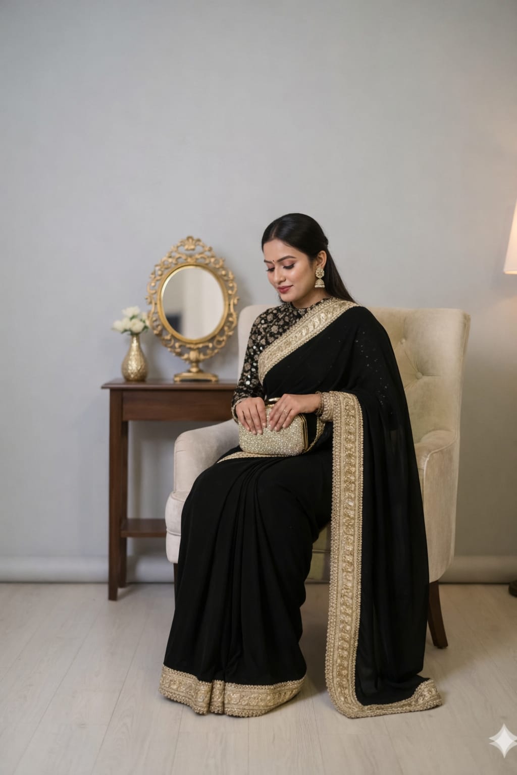Shop our Royal black Velvet Saree with intricate Gold Embroidery. Includes a designer sequin blouse. Perfect for winter weddings and evening parties.